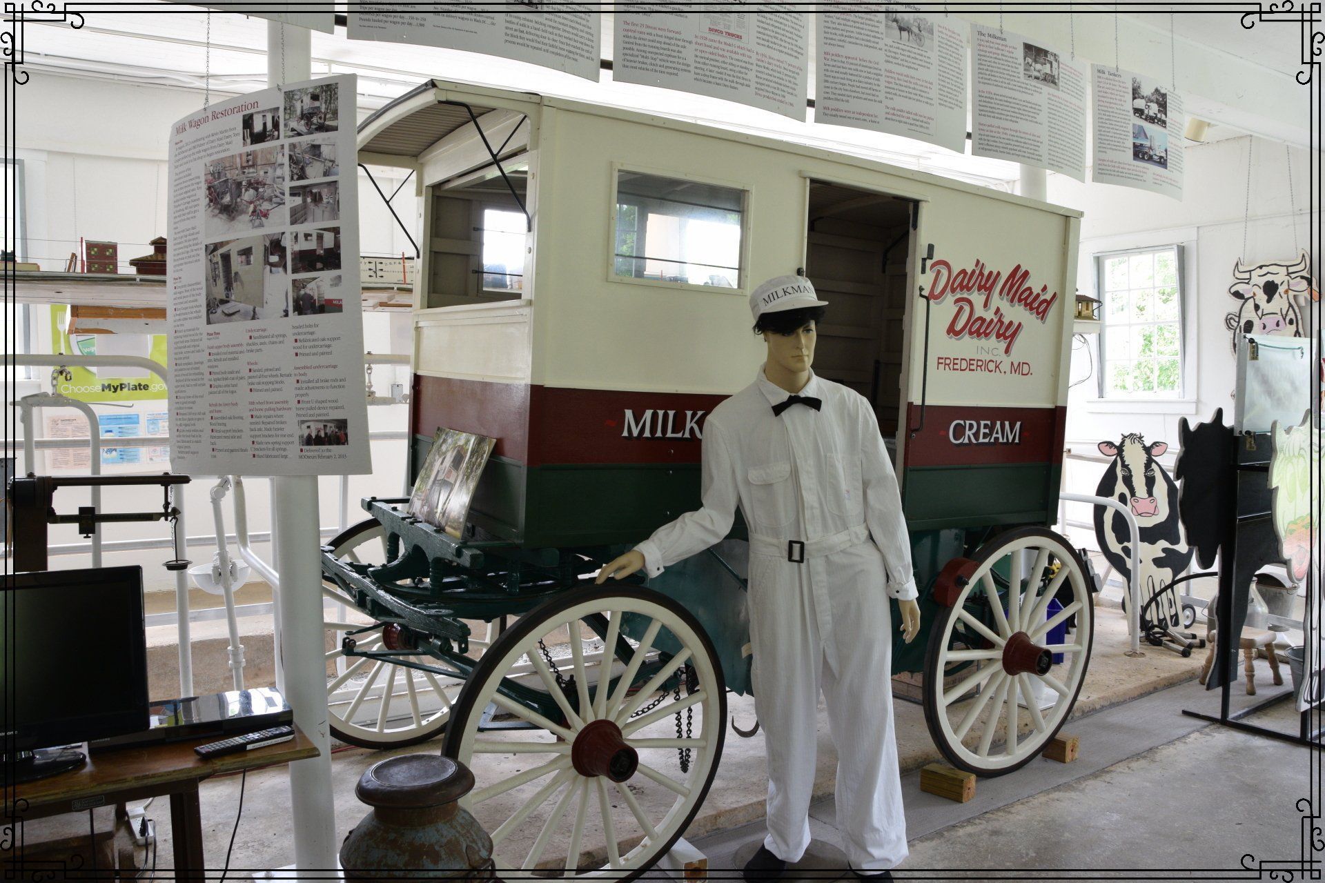 In 2011 Jody Vona, owner of, Maryland’s oldest dairy – Dairy Maid Dairy (originally Excelsior Sanitary Dairy est. 1894), reached out to a colleague from the Maryland Dairy Industry Association, MOOseum Board member and dairy farmer Laurie Savage. Mr. Vona’s family had purchased an antique wooden milk wagon in the early 1950’s in Westminster, Maryland, had lent it out to organizations over the years for parades and other such events. The milk wagon was now in poor shape. He wondered if the King Barn Dairy MOOseum would like the milk wagon for an exhibit. “YES” replied Laurie, and so this historic milk wagon made its way to the MOOseum to assist with telling the story of the transportation of milk. Mr. Vona’s only stipulation to the donation was if the MOOseum ceased to exist, he wanted the milk wagon returned to the Vona family and Dairy Maid Dairy.
